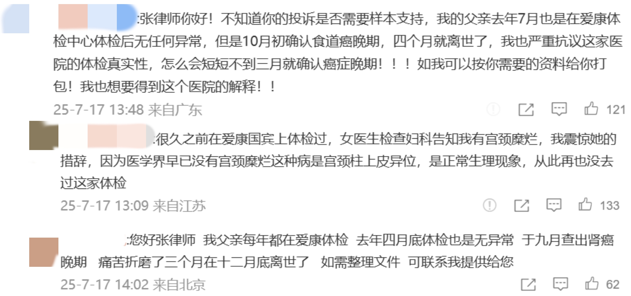 多地客户讲述了在爱康国宾体检中的不良体验:有人认为未能完整识别甲状腺问题,有人认为未能发现子宫肌瘤,更有人通过调取底层影像资料发现,未被充分提示肺癌风险。