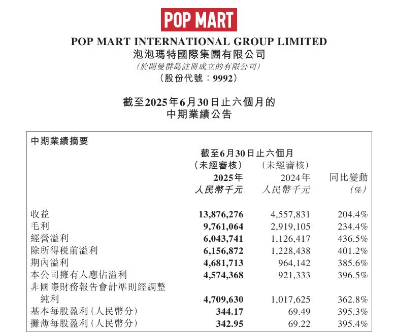 8月19日,泡泡玛特披露2025年中期业绩。财报显示,上半年泡泡玛特营收为138.8亿元,同比增长204.4%,经调整净利润为47.1亿元,同比增长362.8%。上半年公司毛利率为70.3%,同比提升了6.3个百分点,多项数据创下历史新高。