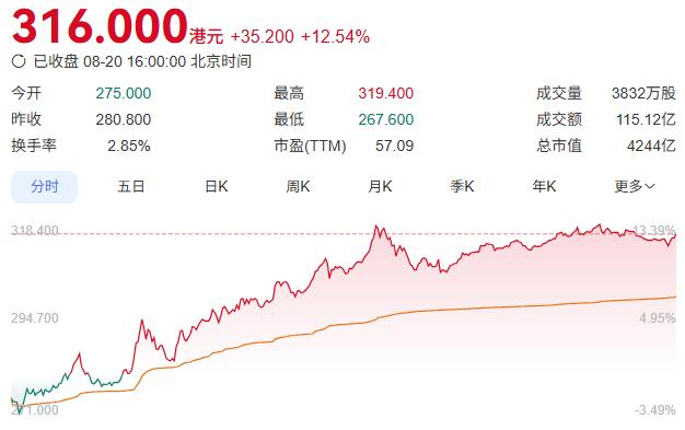 8月20日开盘后,泡泡玛特股价飞速拉升,总市值首次突破4000亿港元大关。
