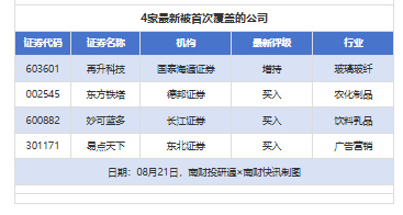 首次覆盖方面,8月21日券商共给出了4次首次覆盖,其中再升科技获得国泰海通证券给予“增持”评级,东方铁塔获得德邦证券给予“买入”评级,妙可蓝多获得长江证券给予“买入”评级,易点天下获得东北证券给予“买入”评级。