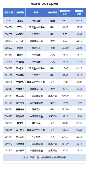 南财投研通数据显示,8月21日,券商给予上市公司目标价共44次,按最新收盘价计算,目标价涨幅排名居前的公司有恒铭达、云天化、南钢股份,目标价涨幅分别为65.18%、55.96%、51.04%,分别属于消费电子、农化制品、普钢行业。