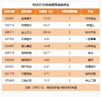 从券商推荐家数来看,8月21日有81家上市公司得到券商推荐,其中盐津铺子获得7家推荐,牧原股份获得5家推荐,金山办公获得5家推荐。