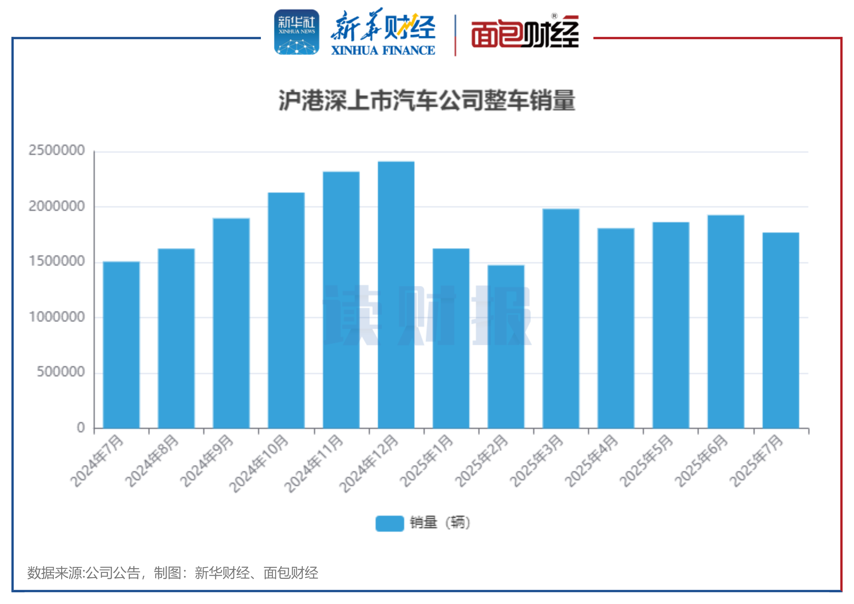 近期,汽车制造厂商陆续披露7月销售数据。新华财经和面包财经研究员以A、H股上市的主要汽车厂商披露的月度销售数据公告,分别统计其整车、新能源汽车的销量。