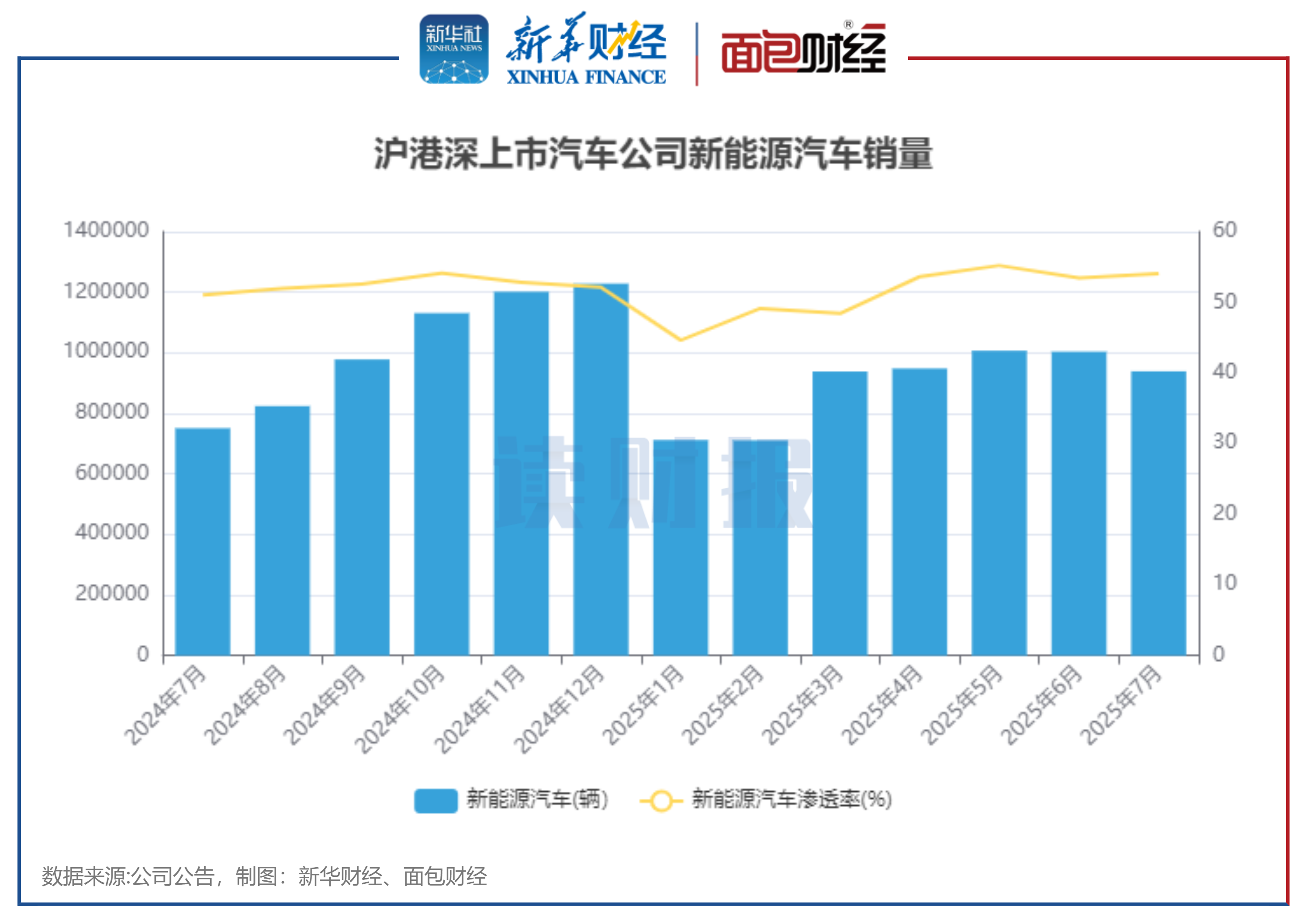 2025年7月,15家上市车企合计销售新能源汽车约93.91万辆,同比上升25.03%,环比微降6.46%,当月新能源汽车渗透率约达54.07%。
