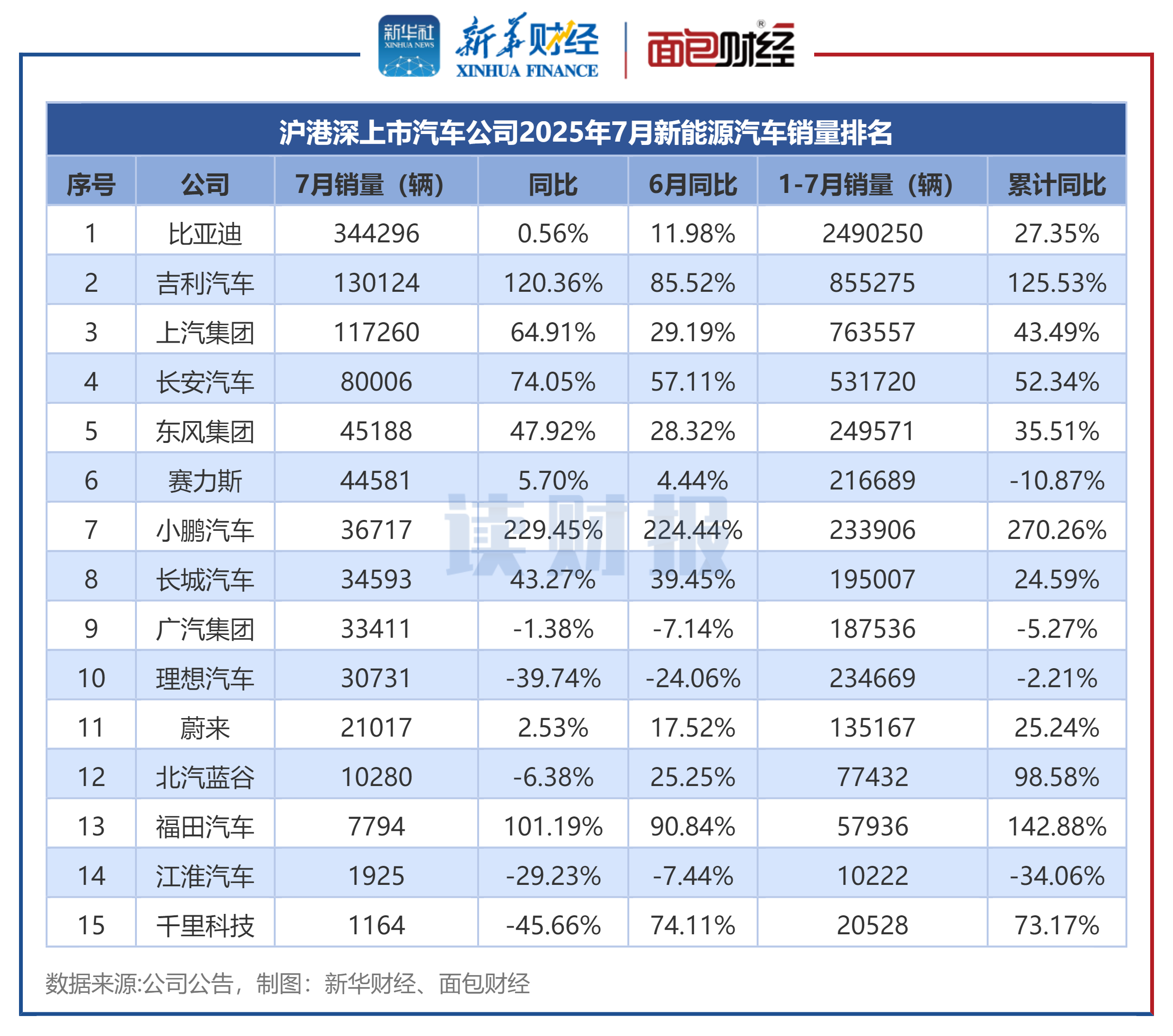 数据显示,比亚迪、吉利汽车、上汽集团的7月新能源汽车销量均超过10万辆,福田汽车、江淮汽车、千里科技的销量低于1万辆。增速方面,小鹏汽车同比增速超过200%,吉利汽车、福田汽车增速超过100%;理想汽车、江淮汽车等5家公司销量同比下滑。