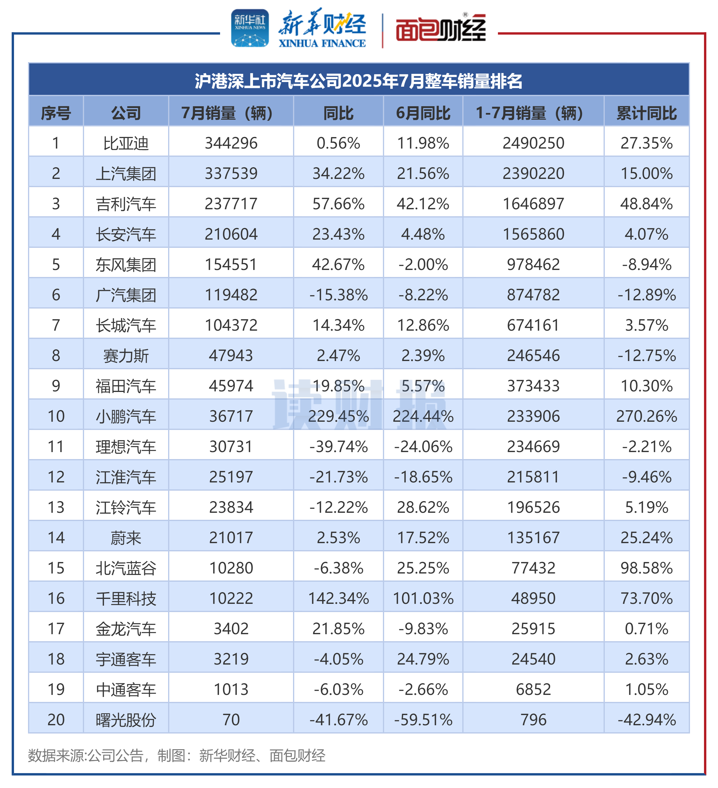 图2:沪港深上市汽车公司2025年7月整车销量排名