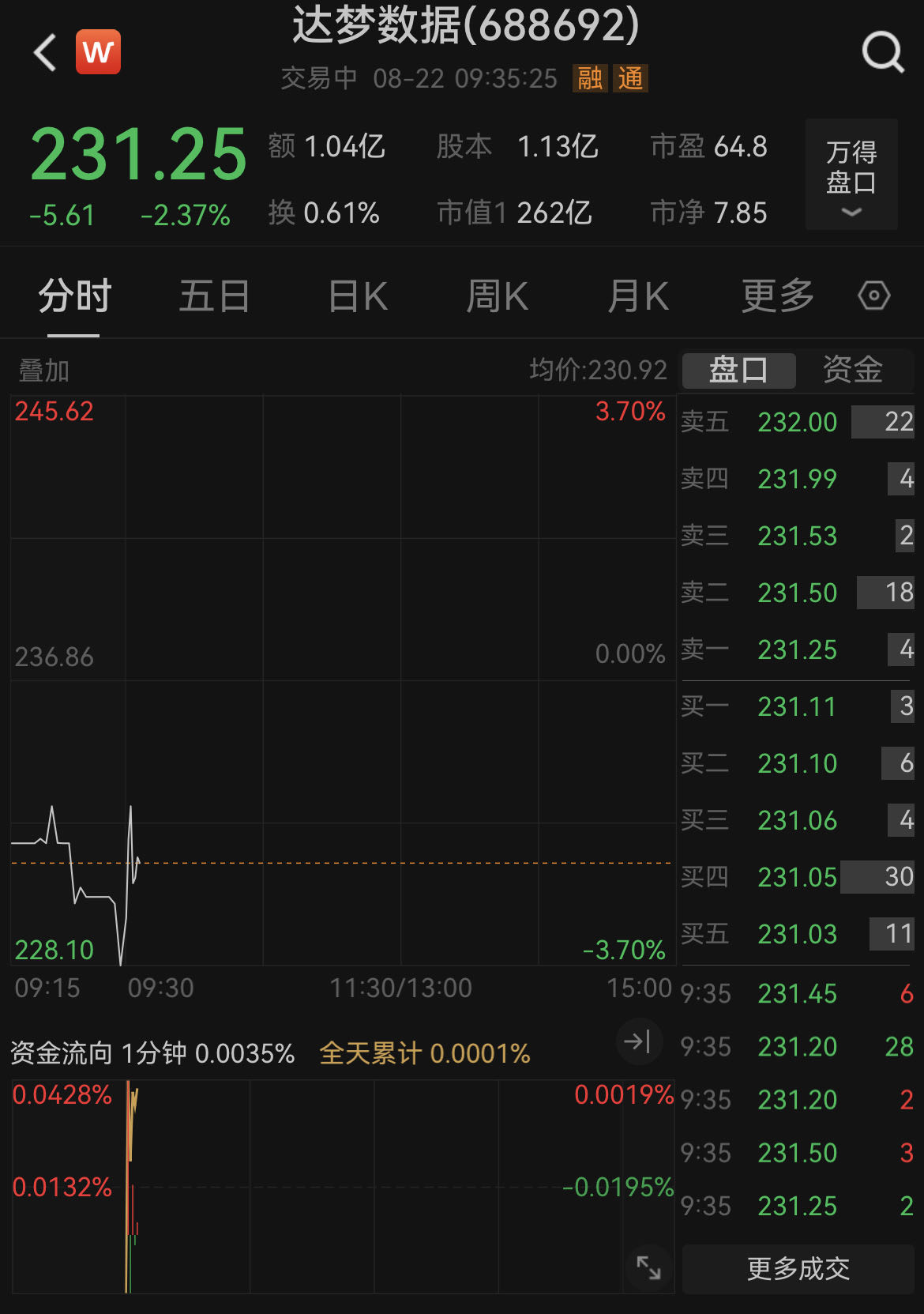 上市刚满一年的“国产数据库第一股”再传利空。8月22日,达梦数据(688692.SH)开盘大跌3.7%,截至9时36分,跌幅收窄至2.37%,报231.25元/股,最新市值262亿元。
