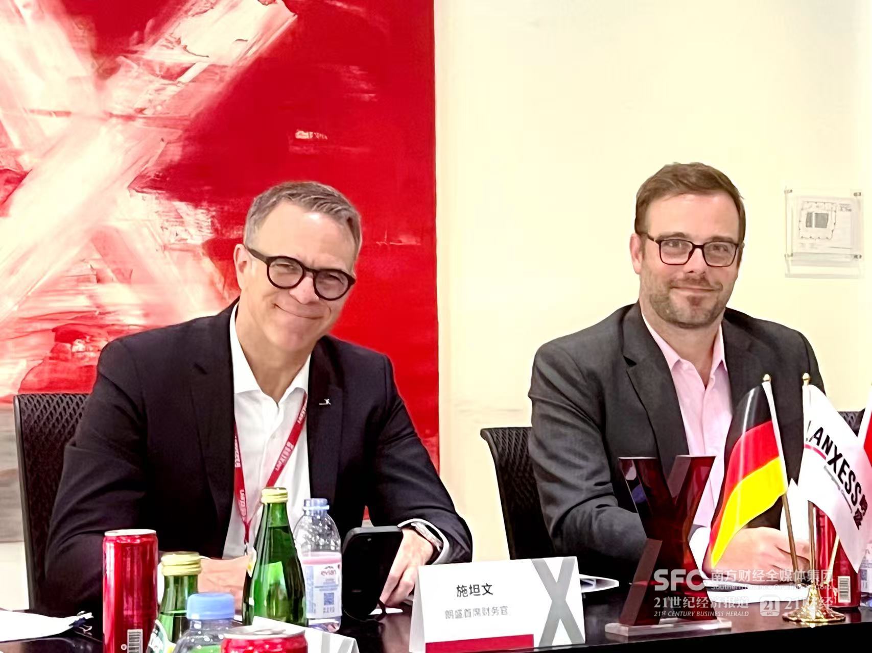 朗盛集团首席财务官施坦文(Oliver Stratmann,左一)、朗盛大中华区总裁罗高名(Michael Rockel,左二)接受21世纪经济报道记者采访