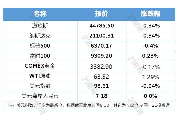 纽约股市三大股指8月21日下跌。截至当天收盘,道琼斯工业平均指数比前一交易日下跌152.81点,收于44785.50点,跌幅为0.34%;标准普尔500种股票指数下跌25.61点,收于6370.17点,跌幅为0.40%;纳斯达克综合指数下跌72.55点,收于21100.31点,跌幅为0.34%。