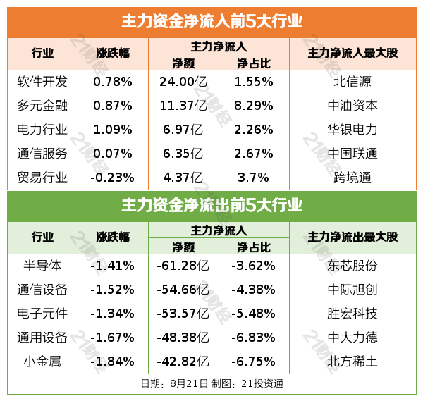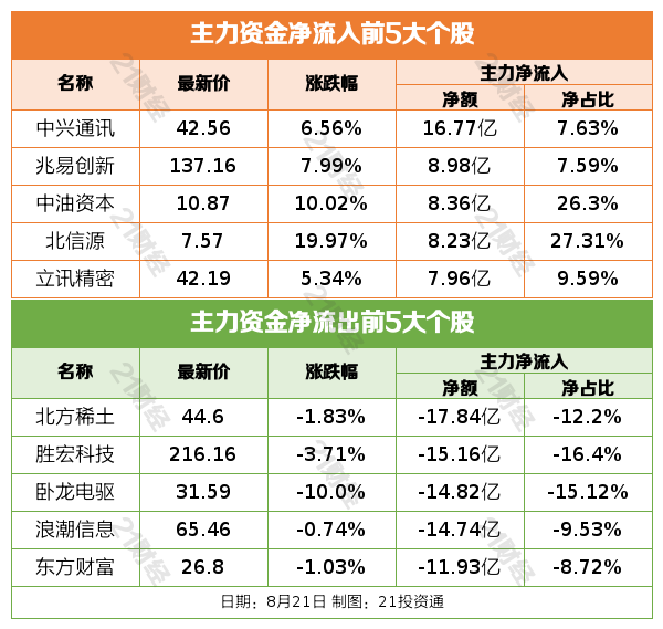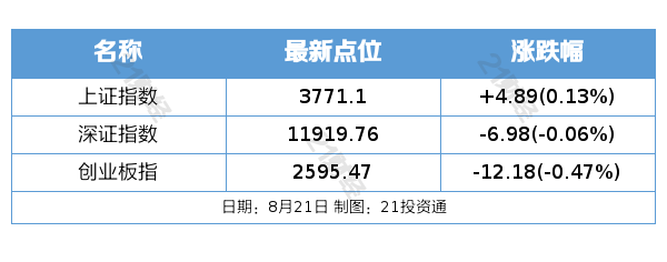 8月21日,市场全天震荡调整,三大指数涨跌不一。截至收盘,沪指涨0.13%,深成指跌0.06%,创业板指跌0.47%。沪深两市全天成交额2.42万亿,较上个交易日放量158亿,成交额连续7个交易日超2万亿。