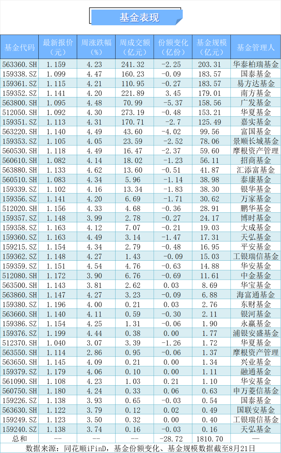本周一,华夏基金管理的A500增指(512370)上市,中证A500基金来到39只。本周,39只中证A500基金中,所有基金均以2%或以上的涨幅收盘,其中,汇添富基金以4.62%的涨幅领涨。从规模来看,当前中证A500基金总规模达1810.70亿元,相较上周有所上升。具体到单只基金,规模排名前三的为华泰柏瑞、国泰基金、易方达基金,规模依次为203.31亿元、183.57亿元、183.57亿元。