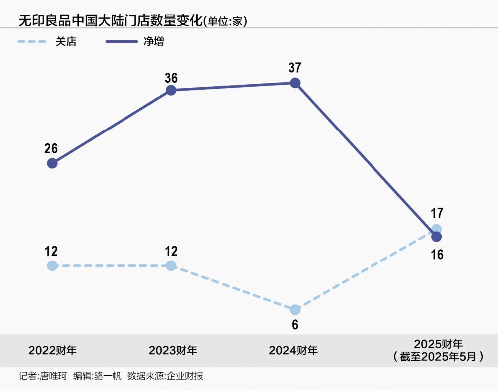 根据MUJI母公司良品计画的官方财报数据,无印良品中国大陆门店数量在2022至2024财年保持扩张:2022年净增26家(关12)、2023年净增36家(关12)、2024年净增37家(关6)。然而,进入2025财年后,扩张明显放缓,截至2025年5月仅净增16家,同期关闭17家,关店数量创新高。