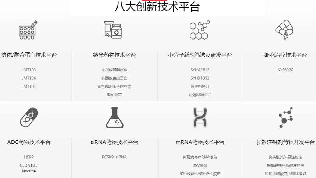蔡东晨团队在肿瘤、精神神经、心血管、免疫和呼吸、代谢及抗感染等六大领域,形成产品矩阵,并搭建了纳米制剂、mRNA、ADC、小分子、长效注射剂等八大技术平台。