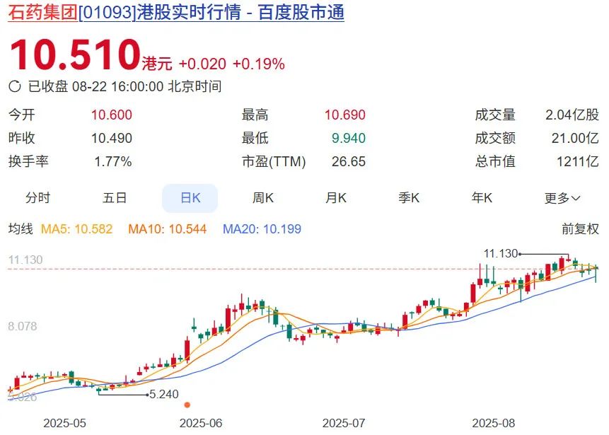 8月22日,蔡东晨实控的石药集团收报10.51港元,市值超1200亿港元,较年初增长超过600亿港元。