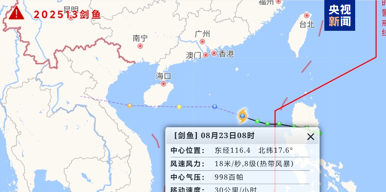 记者从海南省气象局了解到,南海热带低压已于今天(23日)上午加强为今年第13号台风“剑鱼”(热带风暴级;英文名称:Kajiki;名字来源:日本;名称意义:剑鱼星座),上午08时其中心位于海南三亚市偏东约770公里的海面上(北纬17.3度、东经116.7度),中心附近最大风力有8级(18米/秒),中心最低气压为998百帕,七级风圈半径160~220公里。