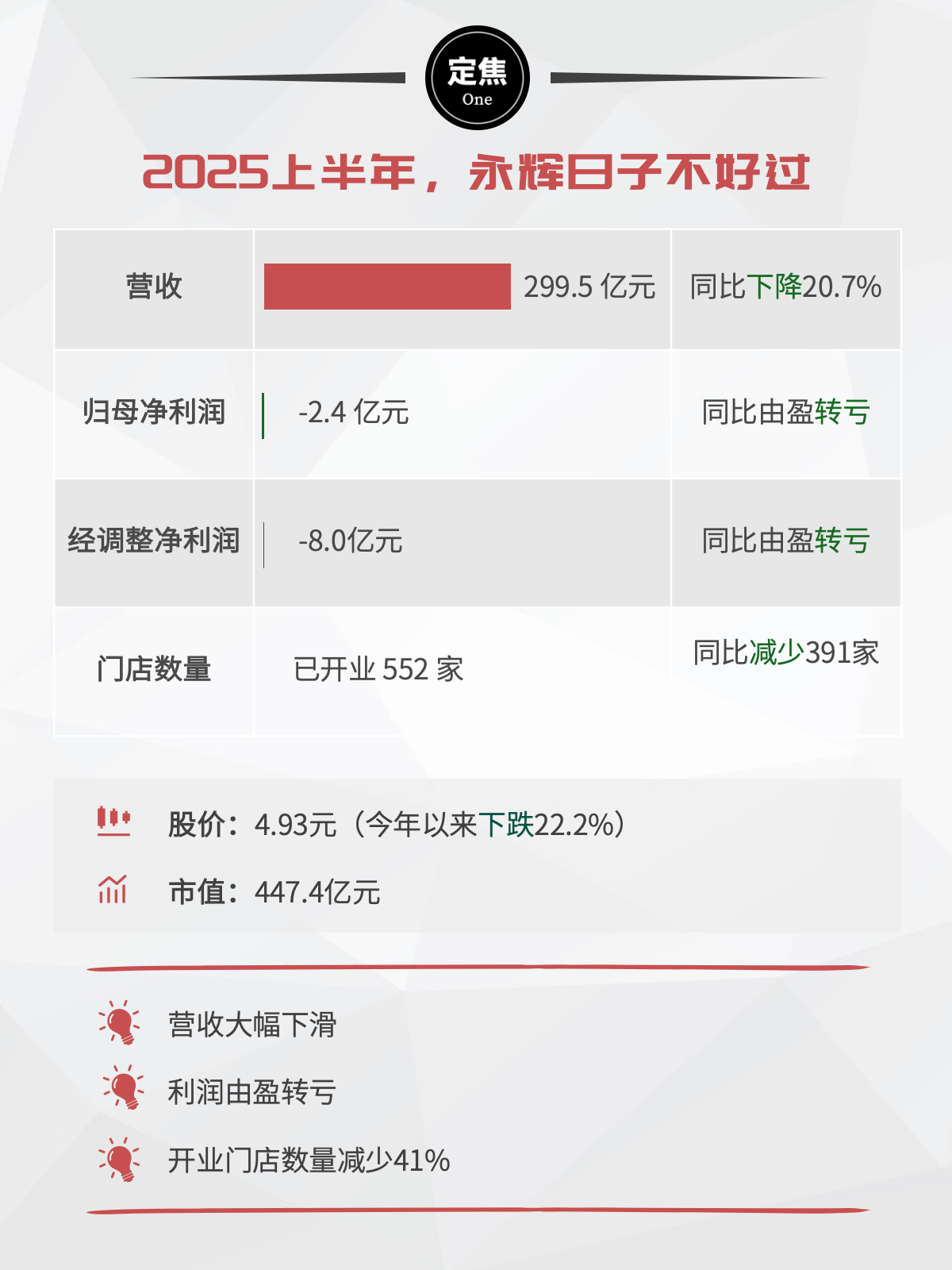 永辉最新财报显示,2025年上半年实现营收299.5亿元,同比下降20.7%;归母净利润为-2.4亿元,经调整净利润为-8亿元,双双由盈转亏。