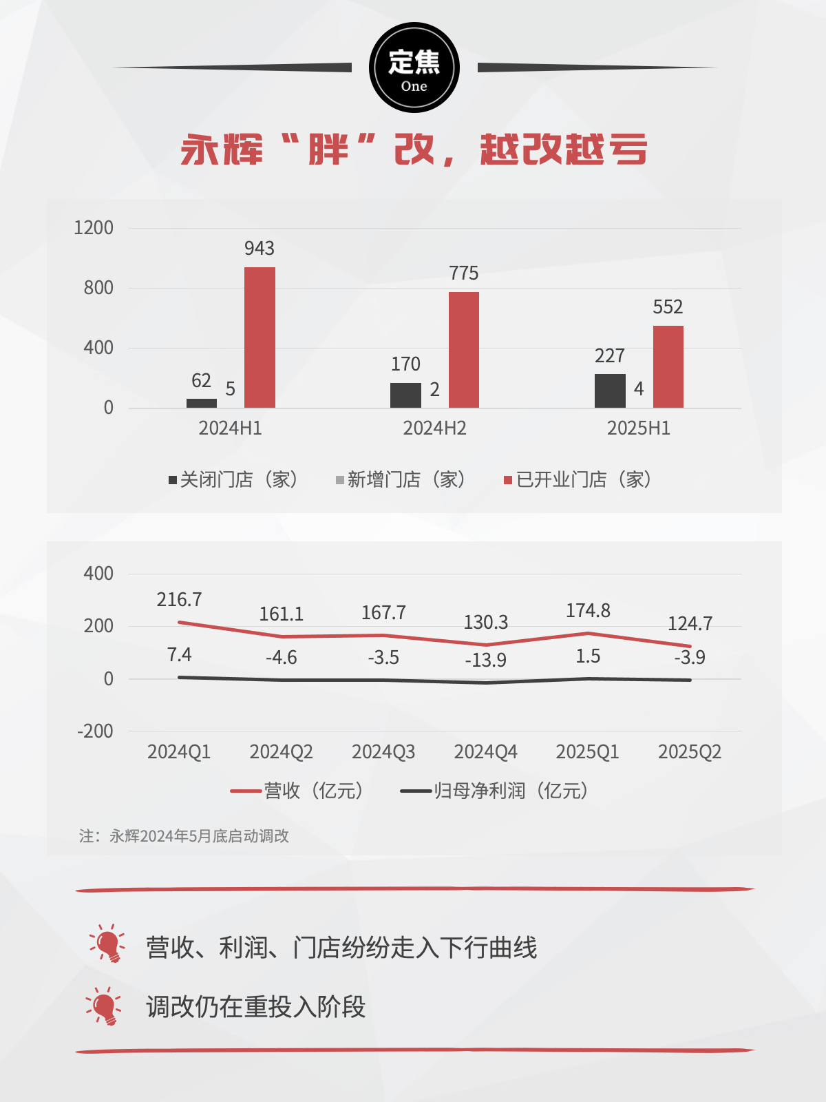 2024年上半年,永辉超市开业门店为943家,到了年底门店缩减至775家,在最新财报中,门店只剩552家。永辉称,其关闭了长期经营亏损门店。但从财务维度看,减重减负暂未带来直观成果。