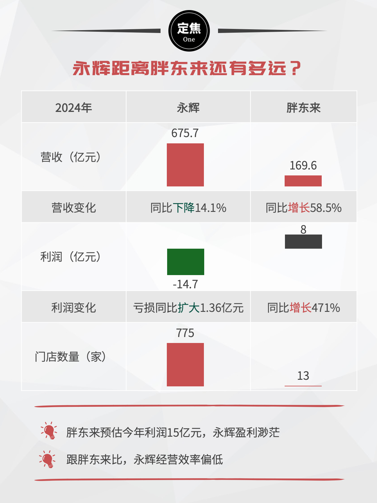对比胖东来2024年业绩,永辉2024年营收同比增加14.1%,胖东来同比增加58.5%;利润侧,永辉亏损同比扩大1.36亿元,而胖东来取得大幅增长。值得注意的是,2024年永辉有775家门店,而胖东来仅有13家门店。