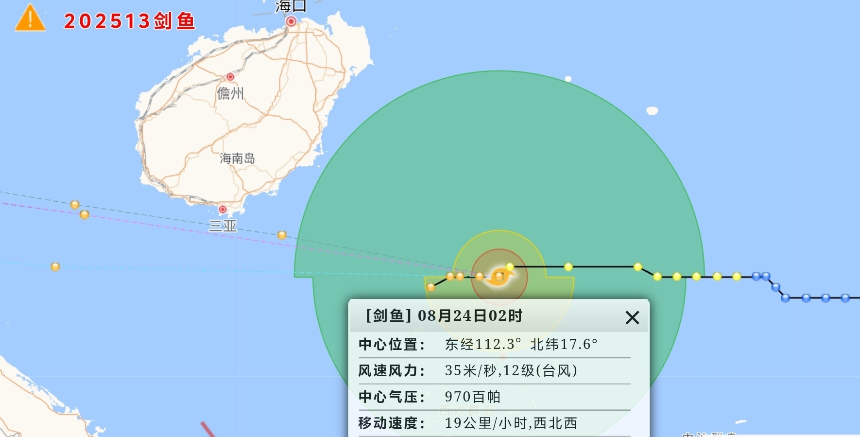 记者从海南省气象局了解到,今年第13号台风“剑鱼”已于24日2时由强热带风暴级加强为台风级。预计,“剑鱼”将以每小时15~20公里的速度向西偏北方向移动,强度快速增强,逐渐趋向于海南岛南部沿海,并将于24日下午到傍晚前后在海南三亚登陆(强台风级),之后趋向越南中北部沿海。