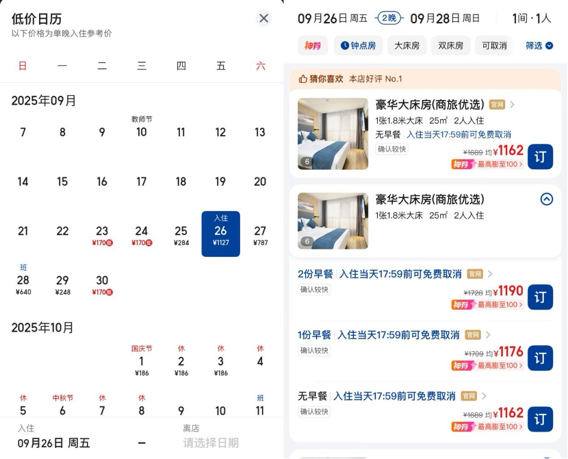 当需求远超供给,住宿价格上涨便成为常态。不久前,周杰伦演唱会官宣9月26日至28日在武汉体育中心主体育场连开3天后,团购平台就显示,场馆周边多个酒店、多个房型已订完。距离武汉体育中心仅390米的雅斯特酒店,平日价格维持在200-300元的常规区间,但在这次演唱会期间房价却飙升至1100元。