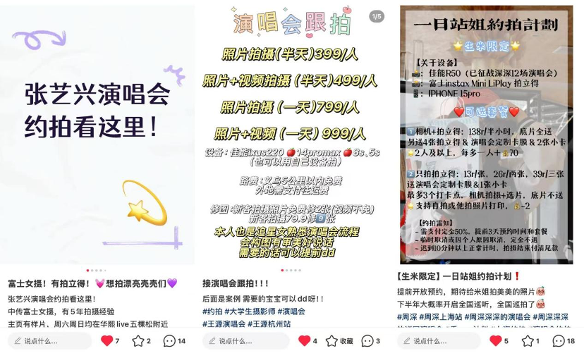 惊蛰研究所观察到,在小红书等平台上,演唱会约妆的相关笔记大多遵循着相似的获客逻辑:展示过往妆容案例、标注价格区间、预留预约通道。随着演出日期临近,评论区便会涌现大量询问档期的留言。这种模式打破了传统服务业的地域局限,让化妆师能在演出前就锁定潜在客户,也让粉丝能提前筛选符合预期的服务,实现供需两端的高效匹配。