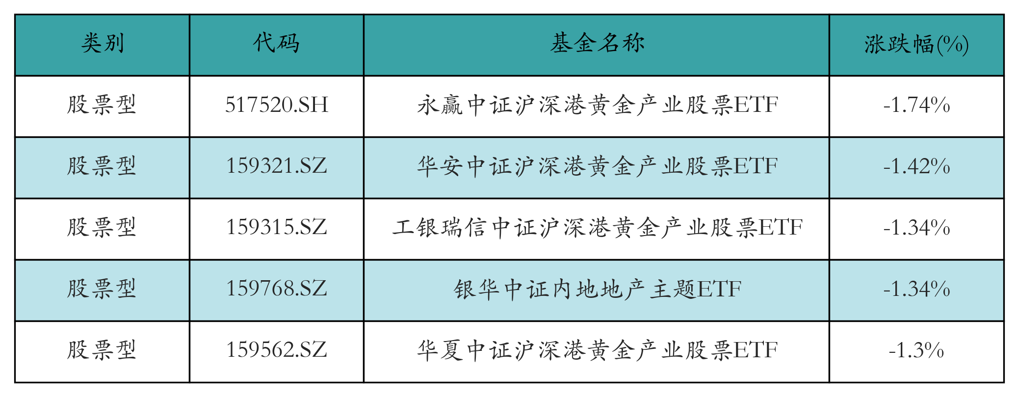 上周股票型ETF跌幅最大的5只ETF及其收益率分别为:永赢中证沪深港黄金产业股票ETF(-1.74%)、华安中证沪深港黄金产业股票ETF(-1.42%)、工银瑞信中证沪深港黄金产业股票ETF(-1.34%)、银华中证内地地产主题ETF(-1.34%)、华夏中证沪深港黄金产业股票ETF(-1.3%)。详情见下表: