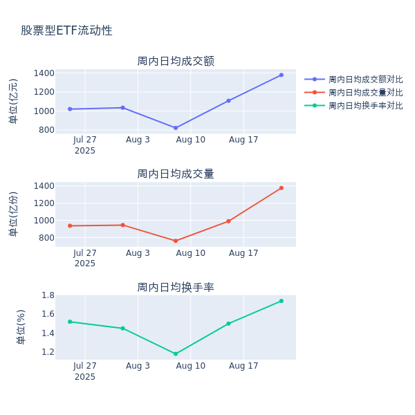 流动性方面,上周股票型ETF市场日均成交额增加24.4%,日均成交量增加39.2%,换手率增加0.24%。