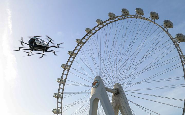 在深圳市宝安区城市空中交通运营示范中心,亿航eVTOL航空器进行展示飞行(2025年4月16日摄)。新华社记者 毛思倩 摄