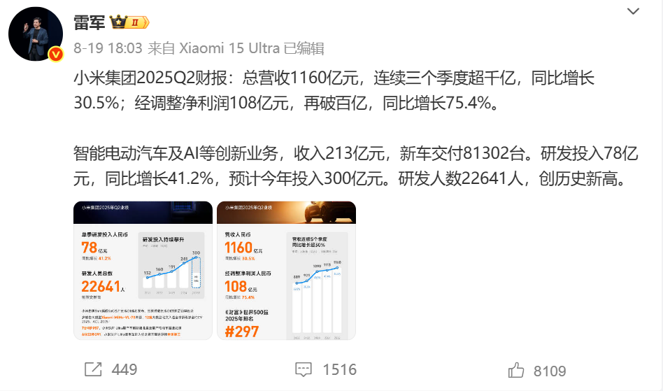 外界再次将焦点投向小米的业绩,2025年二季度,小米依然保持高速增长,实现营收1160亿元,同比增长30.5%;经调整净利润108亿元,同比增长75.4%。