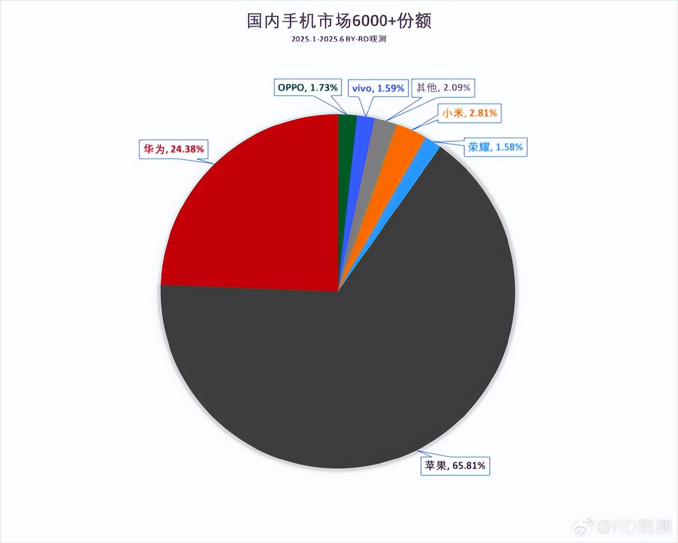 不过,目前几乎所有手机厂商都在打高端市场的主意,根据知名爆料博主“RD观测”数据, 2025年上半年国内6000+高端手机市场份额排名,苹果与华为合计占据九成以上份额,小米手机要实现“跃级”发展,并不是简单的事情。