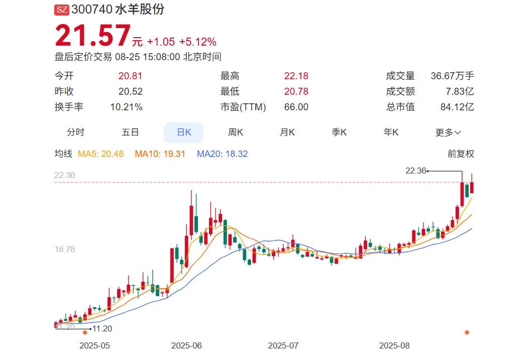 至8月25日收盘,水羊股份市值约85亿元,年初以来大涨60%以上。
