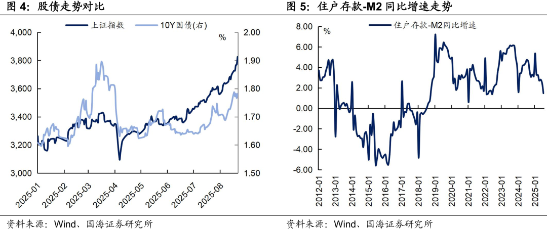 ①股市表现强劲,存款搬家扰动流动性。7月以来,股市加速上涨,上证指数突破去年10月形成的高点,进一步向上突破,市场风险偏好有所提升。在股市强劲表现下,出现居民存款搬家现象,住户存款与M2的同比增速之差快速下行,居民存款流向股市,扰动银行和非银端流动性。