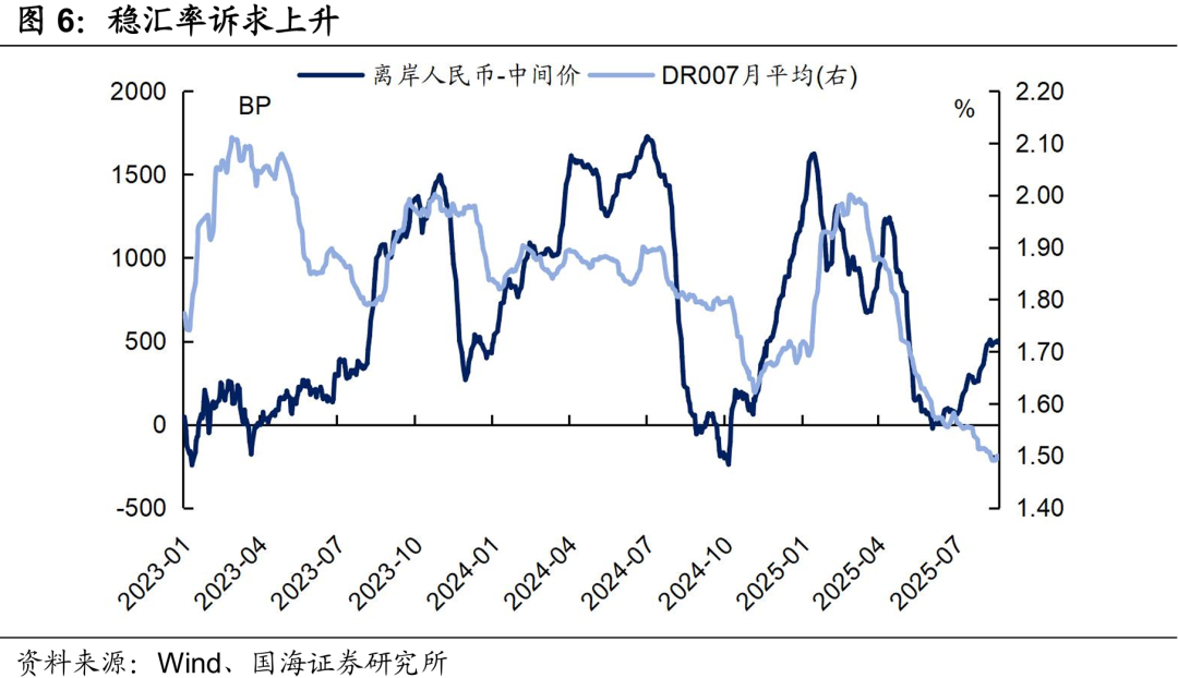 ②汇率诉求上升,资金边际收紧。从离岸人民币与人民币中间价的差价来观察,7月以来,央行稳汇率诉求有所上升。而维持偏高的资金与短债利率,有助于缓解人民币汇率压力。因此,稳定汇率,也促使资金收敛。