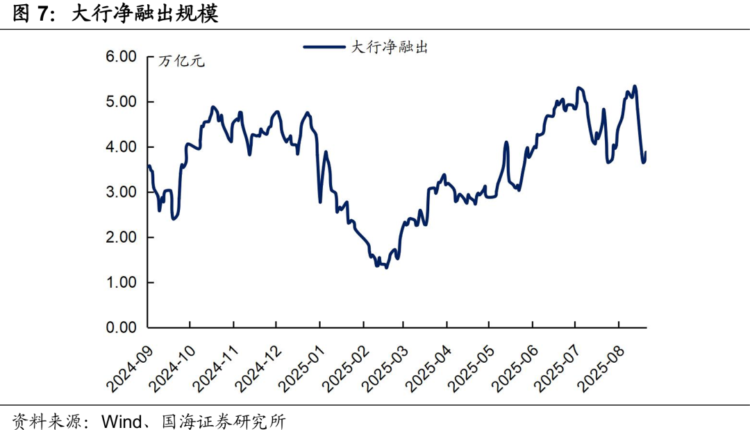 根据以上分析,近期存款搬家至股市、稳汇率诉求上升造成资金面边际收敛,大行净融出规模也随之下降,截至8月21日,大行净融出规模下降至3.88万亿元,相比上周五(8月15日)下降0.95万亿元。向后看,股市情绪火热、稳汇率诉求暂未观察到下降趋势,或对资金面形成扰动。