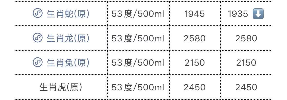 事实上,与高位相比,不少茅台生肖酒当前价格处于“腰斩”的状态。其中,2024年推出的“龙茅”曾被炒高至6000元/瓶甚至更高,最新批发参考价2580元/瓶,与此相比跌去了57%;2023年的“兔茅”目前价格报2150元/瓶,较5500元/瓶高位跌去了60.91%;2022年的“虎茅”目前价格2450元/瓶,与曾经的高位8000元/瓶相比,已跌去了69.38%。