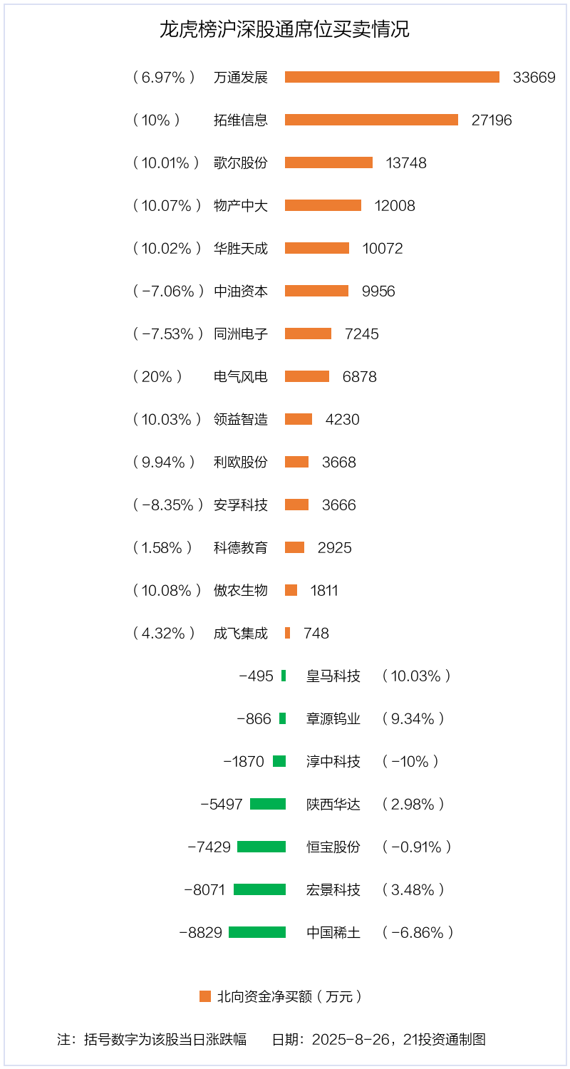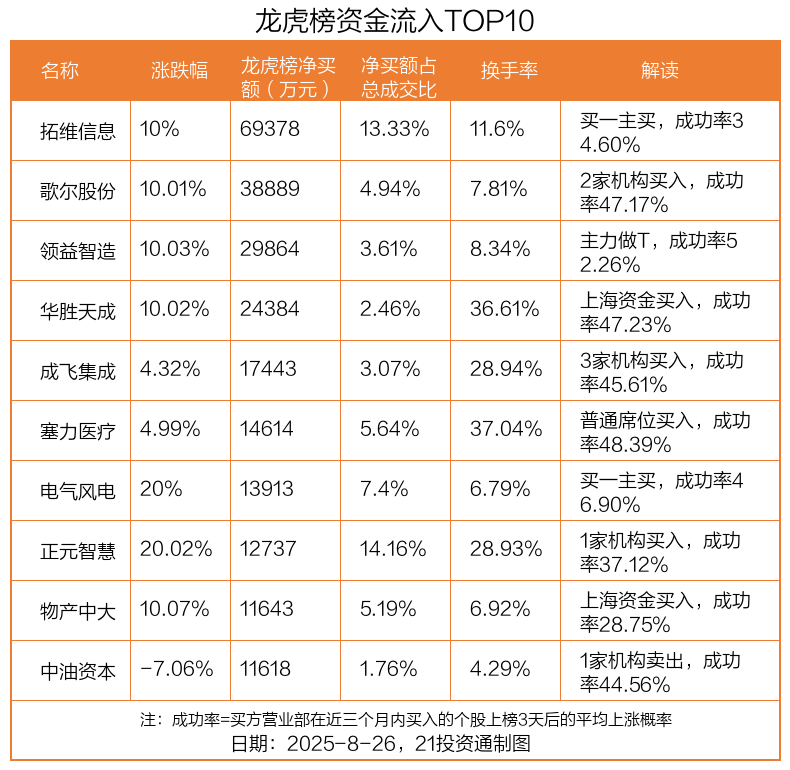 8月26日,上证指数下跌0.39%,深证成指上涨0.26%,创业板指下跌0.75%。盘后龙虎榜数据显示,共有54只个股因当日异动登上龙虎榜,资金净流入最多的是拓维信息(002261.SZ),达6.94亿元。
