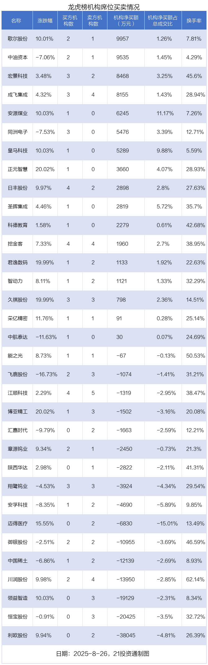 其中,机构净买入金额最多的是歌尔股份(002241.SZ),当日收盘上涨10.01%,换手率为7.81%。