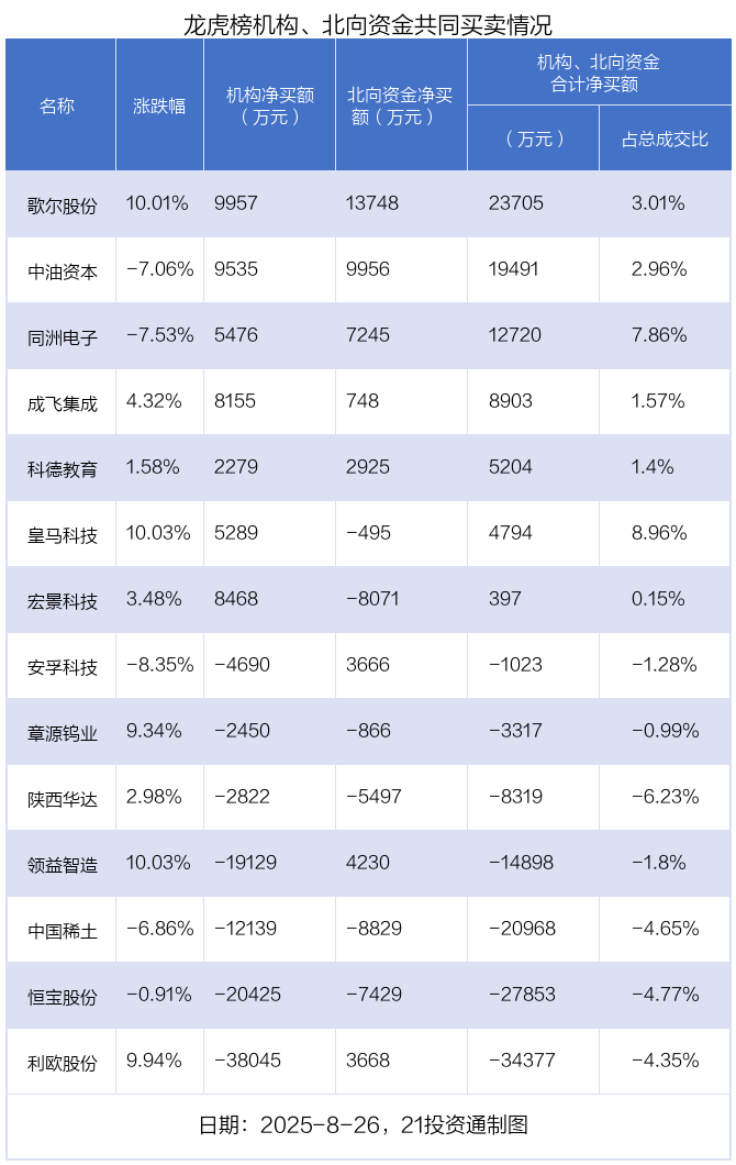 值得注意的是,机构和北向资金共同净买入了歌尔股份、中油资本、同洲电子、科德教育、成飞集成;共同净卖出了章源钨业、陕西华达、恒宝股份、中国稀土;在领益智造,利欧股份,安孚科技,皇马科技,宏景科技上出现分歧,机构净卖出领益智造1.91亿元,北向资金净买入4230.14万元;机构净卖出利欧股份3.8亿元,北向资金净买入3668.23万元;机构净卖出安孚科技4689.7万元,北向资金净买入3666.22万元;机构净买入皇马科技5288.52万元,北向资金净卖出494.64万元;机构净买入宏景科技8468.32万元,北向资金净卖出8071.47万元。