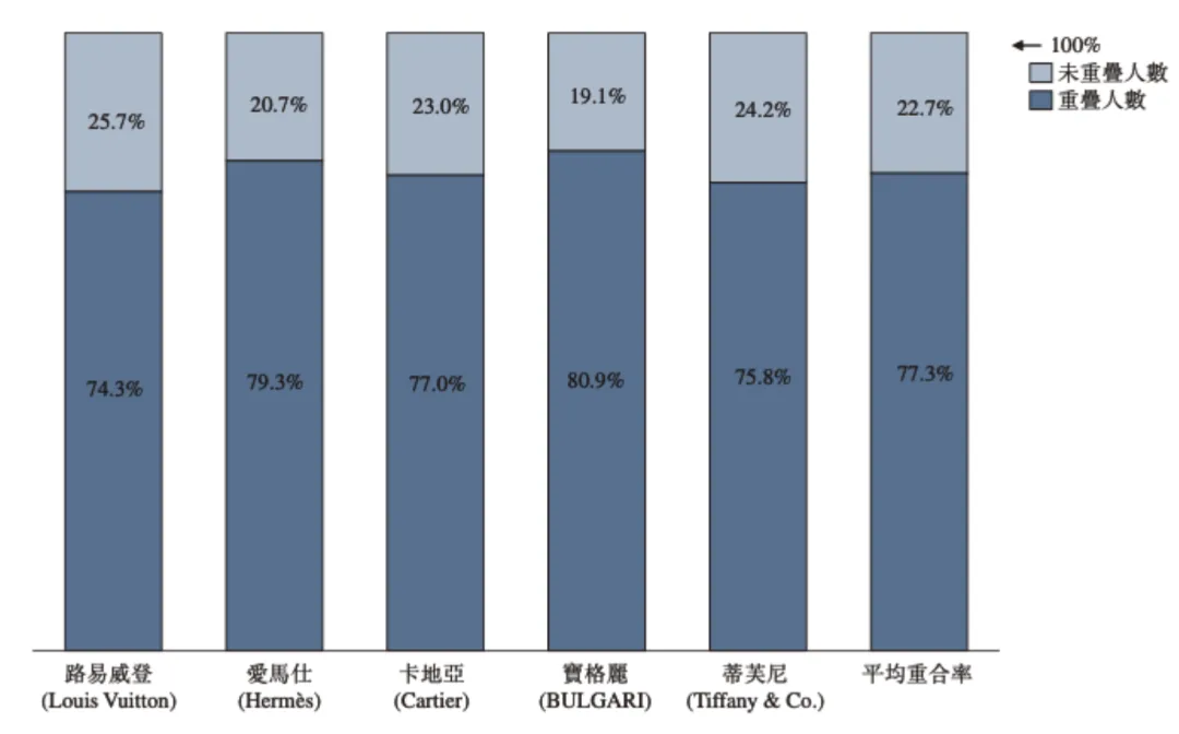 老铺黄金已是目前黄金品牌中的顶流,但它的野心远不止于此。在最新发布的财报中,老铺黄金提到其消费者与路易威登、爱马仕、卡地亚、宝格丽等国际五大奢侈品牌的消费者平均重合率高达77.3%。