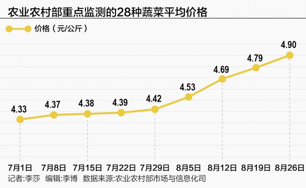6月初,农业农村部重点监测的28种蔬菜平均价格为4.32元/公斤,到8月底,这一指标上涨至4.90元/公斤,在两个月的时间里上涨逾13%。