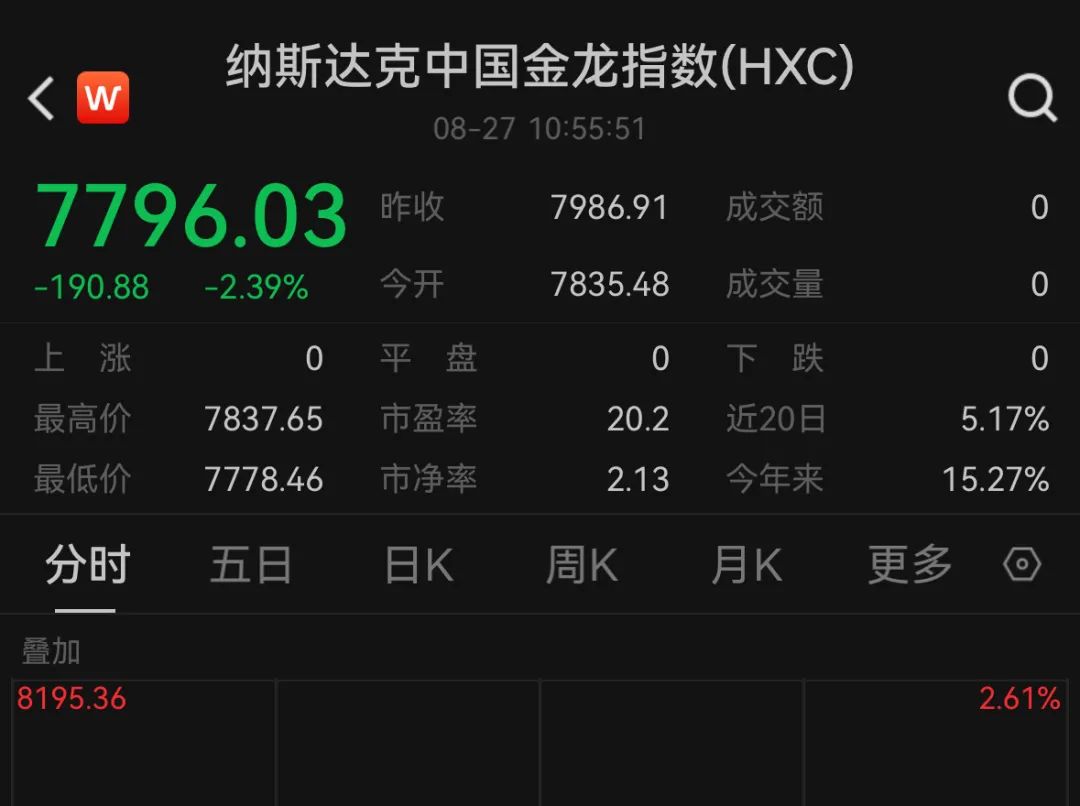 中概股方面,纳斯达克中国金龙指数走低,截至22时40分左右,跌超2%。