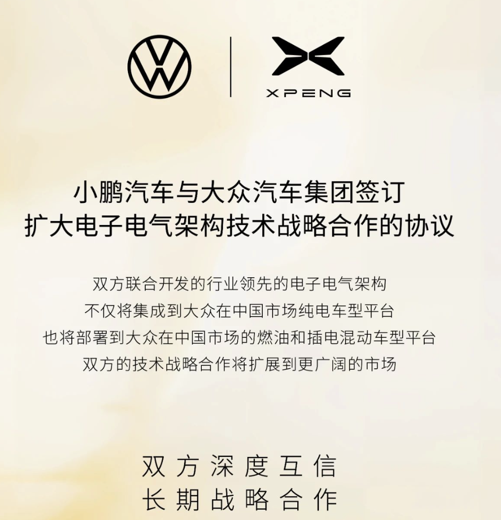 8月15日,小鹏和大众达成了扩大合作的协议。标志着双方联合开发的行业领先的电子电气架构不仅将集成到大众在中国市场纯电车型平台,也将部署到大众在中国市场的燃油和插电混动车型平台。