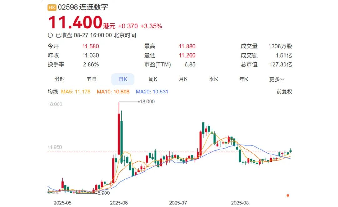 把稀缺牌照收入囊中,需要时间和运气。连连数字的股价回落,截至8月27日收盘,徘徊在11港元/股上下。