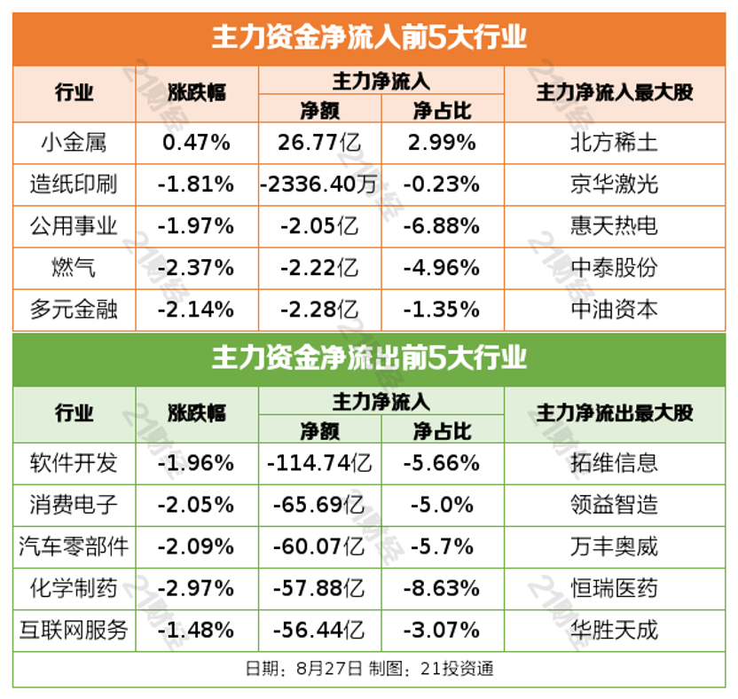 8月27日,A股三大指数今日集体下跌,截至收盘,上证指数跌1.76%,深证成指跌1.43%,创业板指跌0.69%,北证50跌2.6%。沪深京三市全天成交额31978亿元,较上日放量4880亿元。全市场超4700只个股下跌。板块题材上,CPO、稀土永磁、半导体板块表现积极,服装家纺、房地产、白酒、创新药、教育板块跌幅居前。