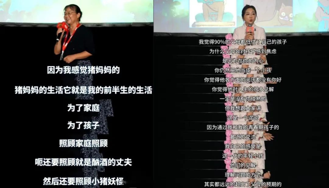活动中,这两位国内女性主义的代表人物也为《浪浪山》带来了“独特”的视角——傅首尔继续展现了她标志性的“独立女性”教育方式,大谈自己离婚带娃的经验,“90%的父母低估孩子”和“人生是旷野”这样的金句,试图将电影中的“家庭温情”解读为“个体觉醒”;苏敏更是大胆地将电影中那个坚守家庭的“猪妈妈”形象,与自己“逃离家庭”的经历相提并论,并高呼“猪妈妈也应该离开浪浪山”的口号。