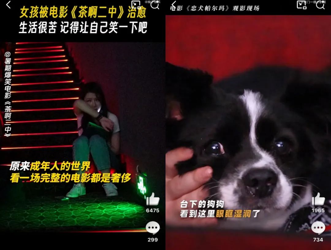 此前,电影《茶啊二中》的片方策划了一个“打工人边工作边看电影,然后看哭了”的短视频,却被质疑摆拍痕迹过重;《忠犬帕尔马》则把宠物狗们拉进观影厅,上演了一幕幕“狗都看哭了”的名场面。
