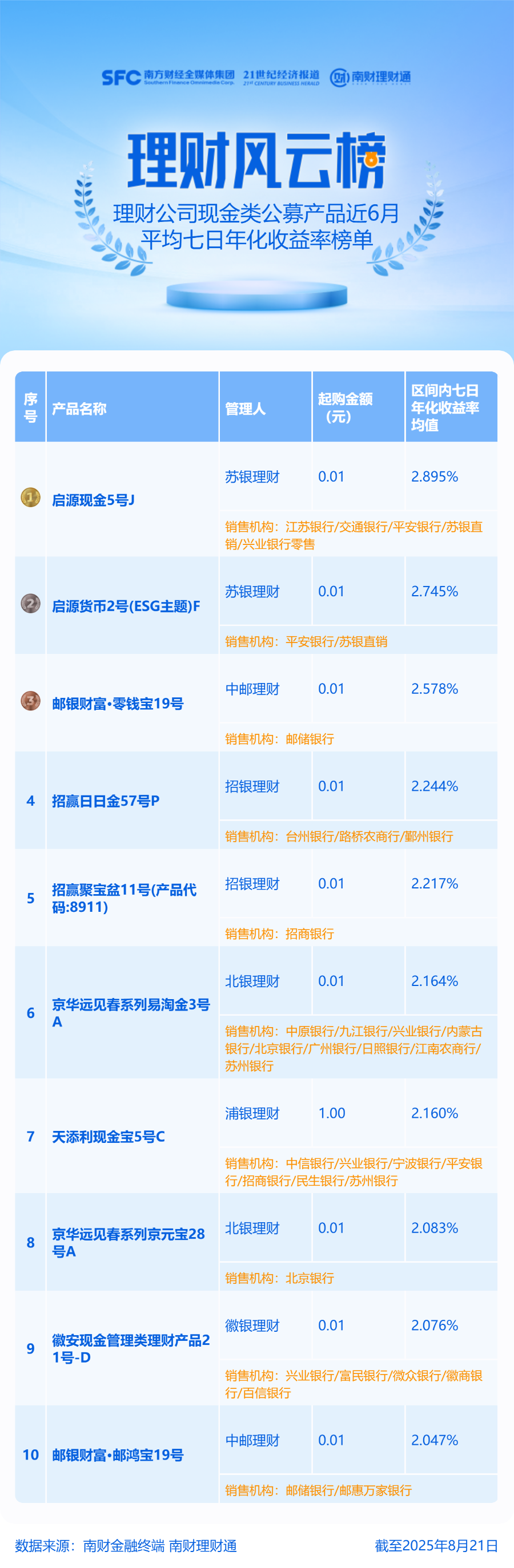 产品统计范围为理财公司发行的公募现金类产品,统计截止日期为2025年8月21日,统计区间为近6个月。