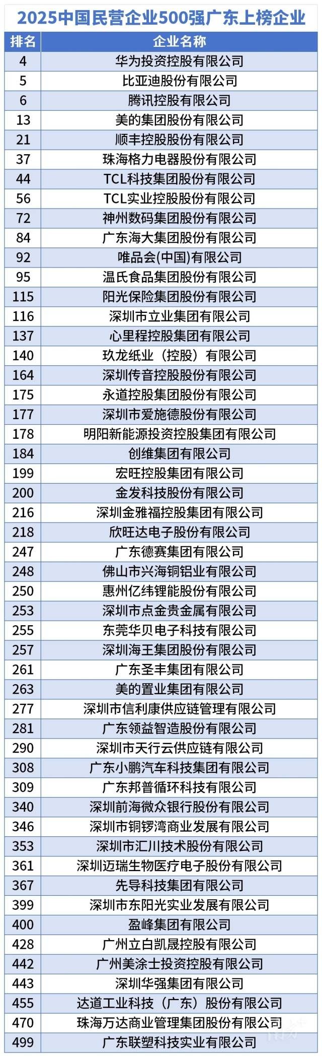 8月28日,全国工商联发布“2025中国民营企业500强”榜单和《2025中国民营企业500强调研分析报告》(下称“报告”), 广东共有51家企业上榜,数量位居前列,其中不乏来自新兴产业的新面孔。