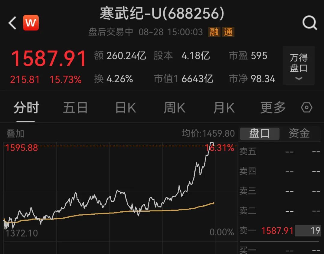寒武纪尾盘翘尾拉升,涨超15%,股价站上1587.91元再次超越茅台,中芯国际单边拉升创历史新高。