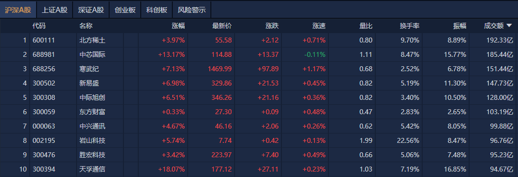 沪深两市半日成交额1.79万亿元,较上个交易日放量617亿。个股方面,北方稀土成交额超192亿元居首,中芯国际、寒武纪、新易盛成交额靠前。